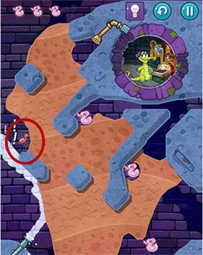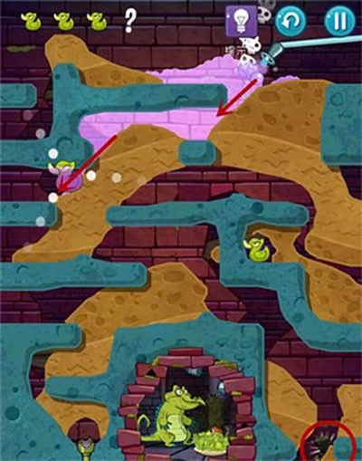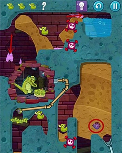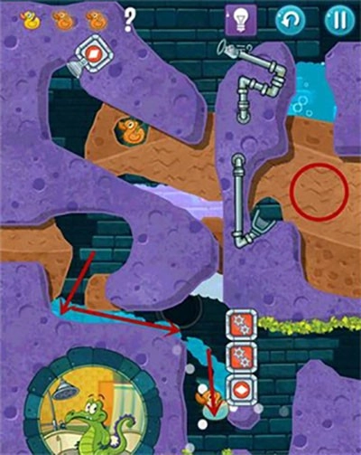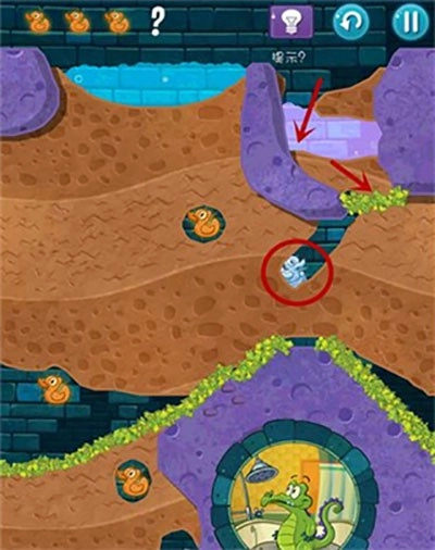 2、本关第一步要划开通往上方那只鸭子的路径,打开红色的水闸开关。之后泥浆遇到青草就会变成石头。