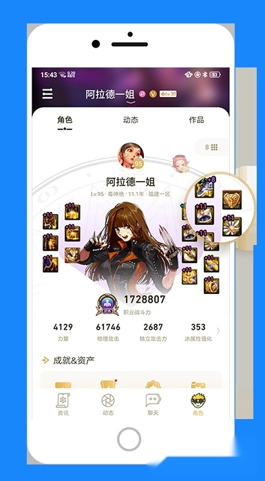 个人主页设有角色卡,支持百科查询装备增幅强化属性、战力数值,还能实时查看战绩、周报等数据;
