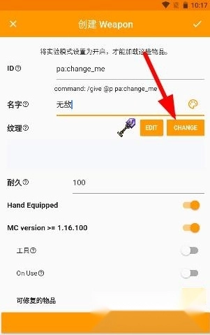 5、选好物品进入编辑界面后,id无需修改,名称可自行随意输入,之后点击文字较多的那个按钮。