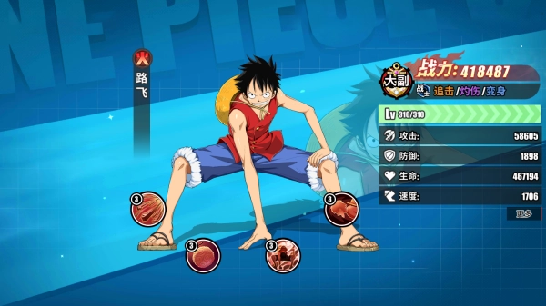 ●装备推荐:在装备和技能选择上都以攻击,暴击,伤害加成为主,提高路飞的输出能力。