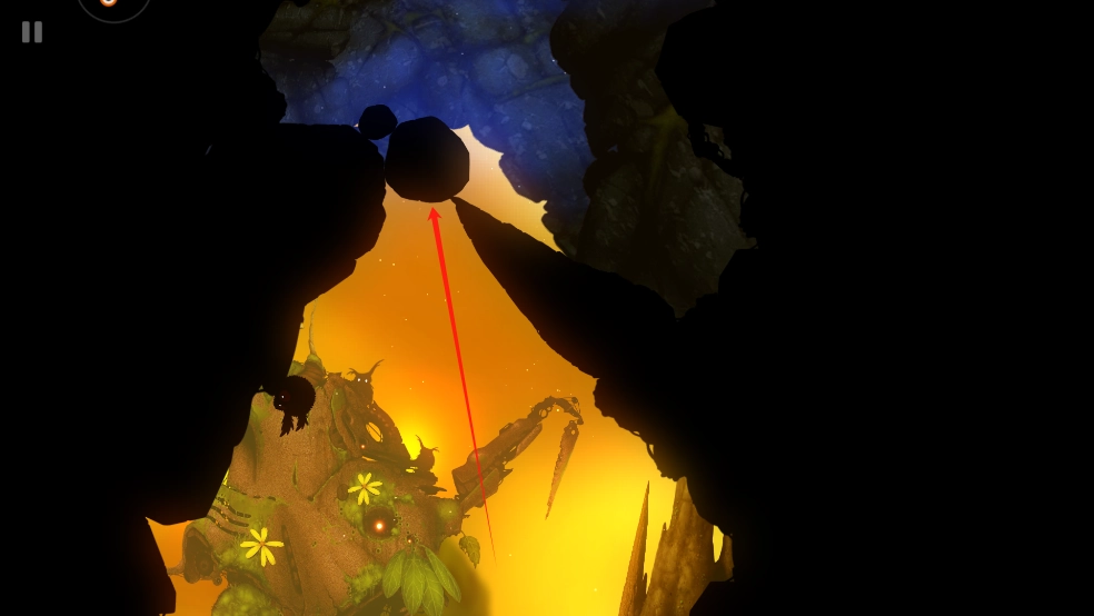 4、游戏画面会持续追赶小精灵,一旦画面没能跟上小精灵就会直接失败,所以要冲破这块石头,别让画面追赶上小精灵。