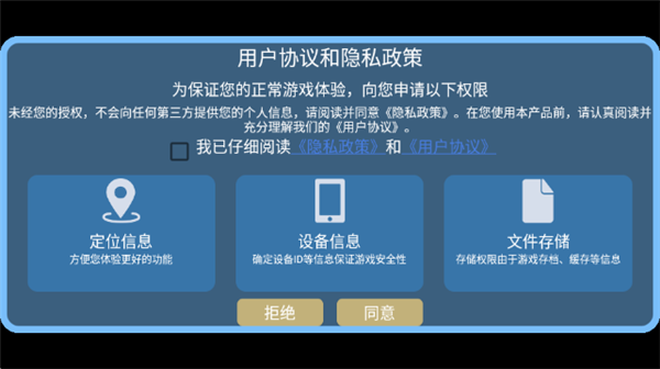 1当首次踏入游戏时,需先阅读《用户协议》与《隐私政策》,之后勾选“我已仔细阅读《隐私政策》和《用户协议》”选项,再点击“同意”按钮,方可进入游戏。
