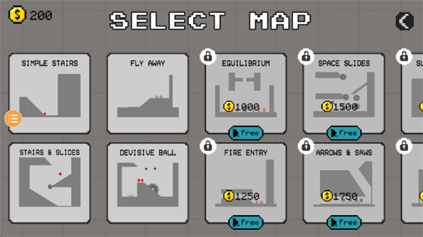 3. 在“SELECT MAP”界面中,能够挑选不同的地图,像“SIMPLE STAIRS”“FLY AWAY”等等,有部分地图需要消耗金币或者满足一定条件才能解锁。