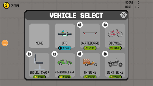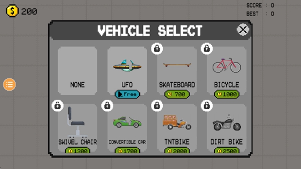 8. 在“VEHICLE SELECT”界面,能够挑选不同的载具,像“UFO”“SKATEBOARD”“BICYCLE”等等,有一些载具需要耗费金币或者满足条件才能解锁。