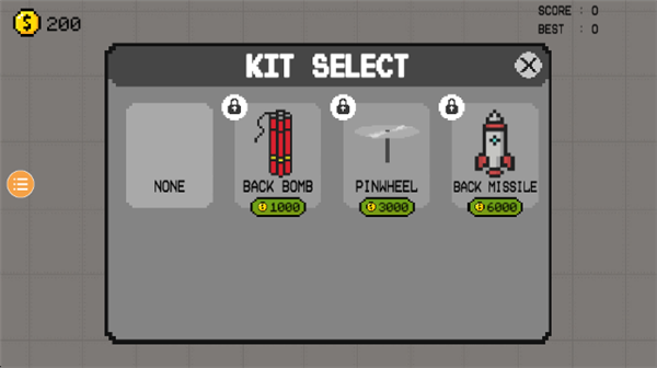 7. 在“KIT SELECT”界面,能够挑选不同的道具包,像“BACK BOMB”“PINWHEEL”之类,有部分道具包需要消耗金币来解锁。