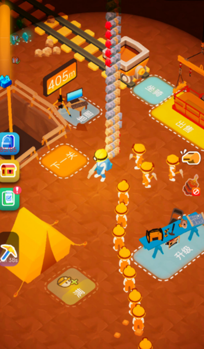 装备升级与角色成长:通过赚取的金币,可以升级抓钩的长度、移动速度、背包容量以及购买爆炸物等强力道具,提升采矿效率。
