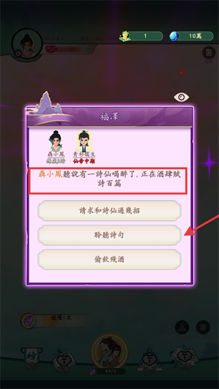 3、遇诗仙醉酒事件,选择【聆听诗句】,可获取感悟,提升自身属性,助力修仙进程。