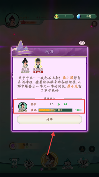 4、游历后悟性升至74、修为加1000,点击【好的】确认变化,可继续后续历练或活动。