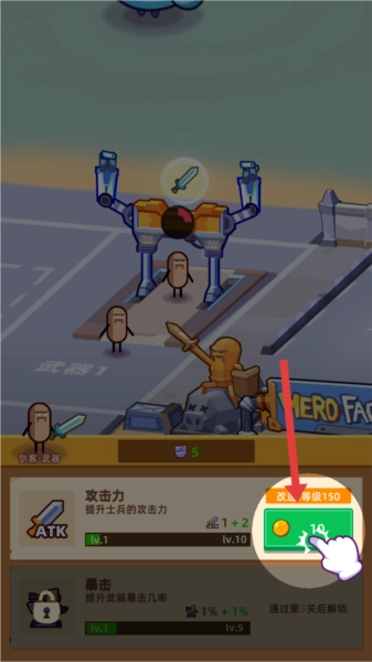 1.进入游戏后,根据指引点击士兵脚下的光环开启升级界面。