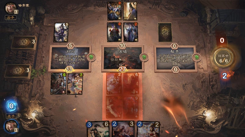 4. 对局时下方是手牌区,每个回合从自己卡组摸一张牌,手牌区最多能存7张手牌。每个回合放置到战场的武将,其粮草消耗总和不能超过当前回合的粮草数量。武将放到战场后,点击右侧按钮结束回合。先手玩家(左边头像旁会显示“先手”标识,对应另一方为“后手”)先亮出武将,随后后手玩家亮出武将。对局过程中,长按战场右上方的勾玉可对该战场进行加倍操作,加倍后战场勾玉数变为2;若对方也对这个战场进行加倍,勾玉数则变为4。