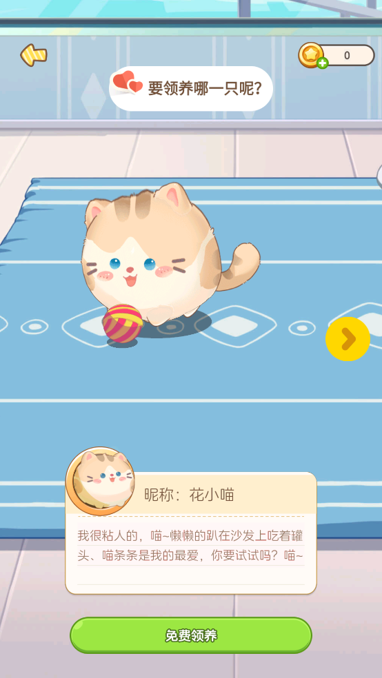 1、进入领养界面后,按照箭头所指的方向点击【免费领养】按钮,即可领养那只名叫“花小喵”的猫咪。