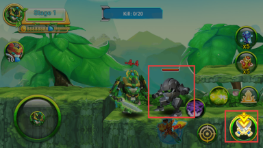 2、操控机甲角色,点击右侧技能,攻击灰色机甲敌人。