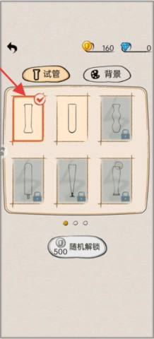 3、玩家点击【试管】选项后,既能解锁各式各样的试管,也能消耗已获得的金币来进行随机解锁操作,以此提升游戏的趣味性。