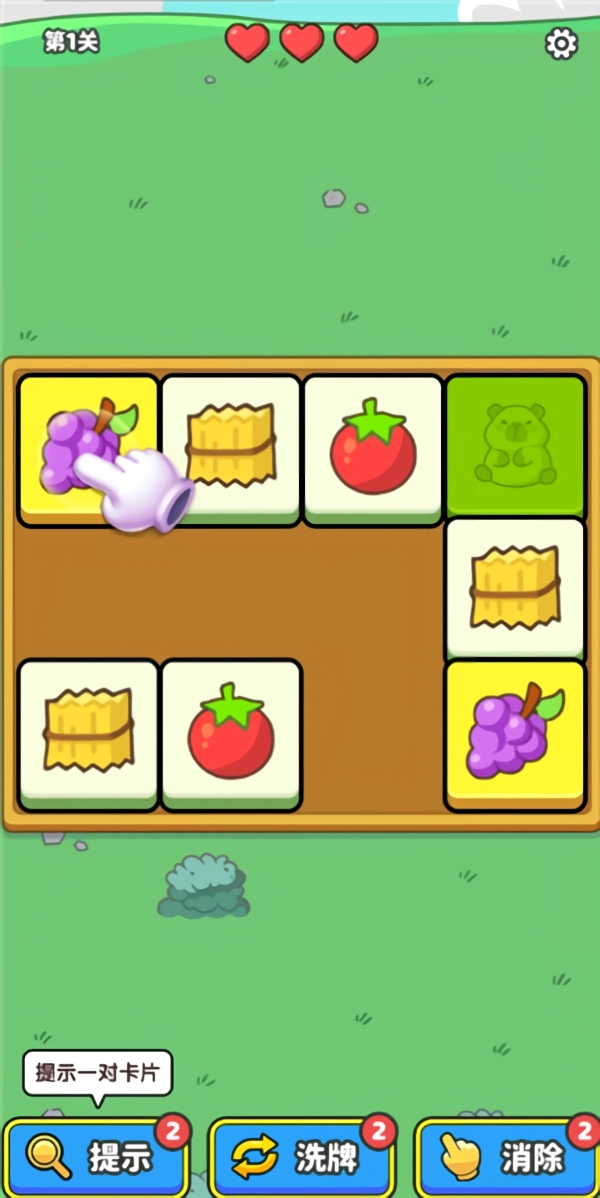 1、游戏开始后,按照新手引导的提示,点击图案相同的卡牌来完成消除操作。