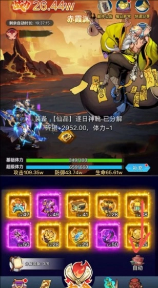 玩家分解装备时会消耗体力值,体力值耗尽后将停止攻击并进入休整状态。体力存在上限,基础体力值每日0点自动恢复,玩家也可消耗金石购买超级体力——补充体力的同时,还能大幅提升分解装备获取的碎银数量。