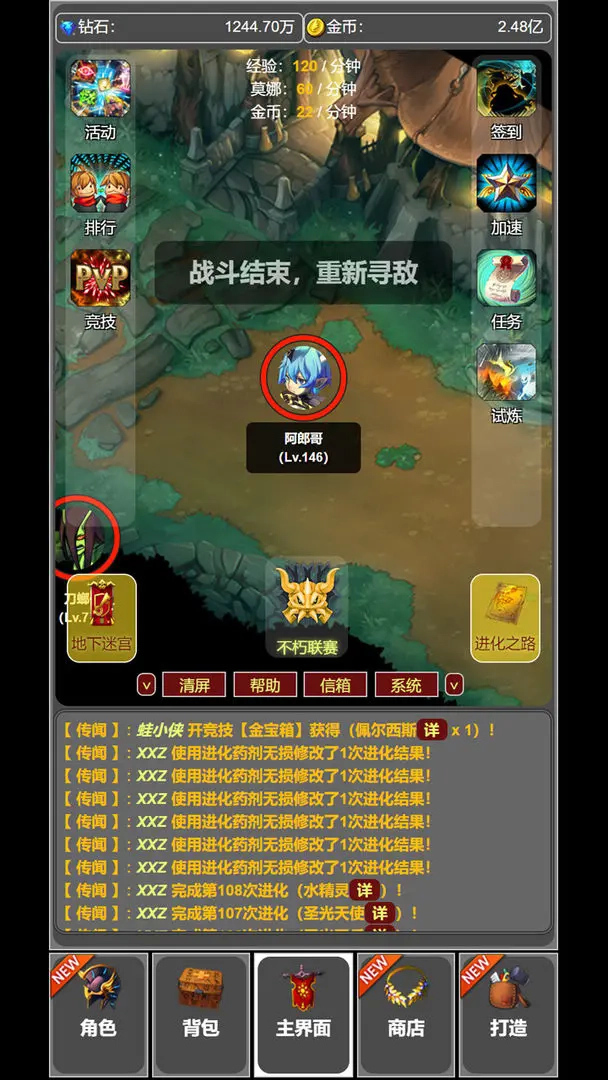 1、要是游戏里还有进化的机会,你可以选择抽取卡片,或者去新解锁的地下迷宫获取装备和卡片。在地下迷宫里,每打败一层的BOSS后,玩家就能在线挂机清理当前层的小怪。不过要注意,挂机时每次战斗都会消耗1点体力,所以不建议在低层待太久。