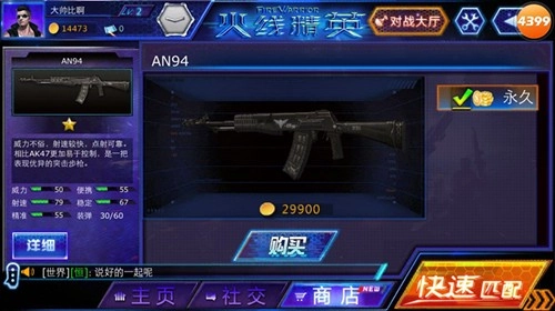 AN94作为《火线精英》手机版里为数不多的“长”步枪,其长度几乎接近狙枪,虽然“体型”略显臃肿,但丝毫没有妨碍AN94成为走心枪械之一,在游戏商店里仅需29900金币即可购得。AN94威力悍烈,射速快,射程远,虽然弹道与M4A1、95式步枪相比会稍显逊色,但运用得当后容易把握弹道规律,非常适合泼射,巧妙风骚的泼射能让你枪枪爆头!