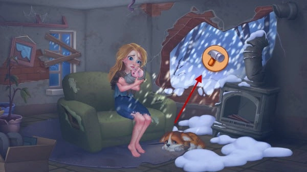 2、主角首先会在一个破烂的房子中,需要修补好各种漏洞,帮助她生存下来。点击锤子图标。