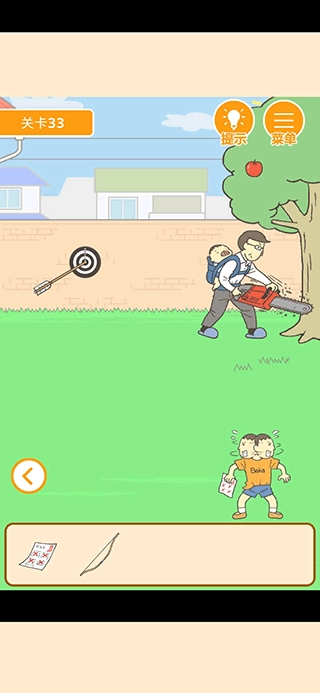 用弓箭打下苹果,试卷放在桌子上,得到面具。给小孩子。再把锯子给他。