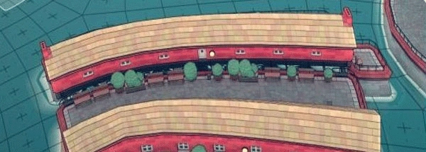 4、将成排的房屋地面镂空,可以减少两侧的门,增加两侧的植物和长椅,会有公园的感觉。