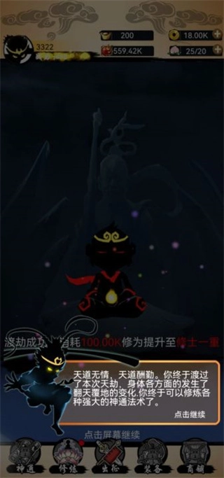 5、玩家还可以进行修炼,每到修炼达到就可以点击突破,每突破几个阶段就需要渡劫,渡劫失败了会损失修为,渡劫成功则可以提升自己的修为。