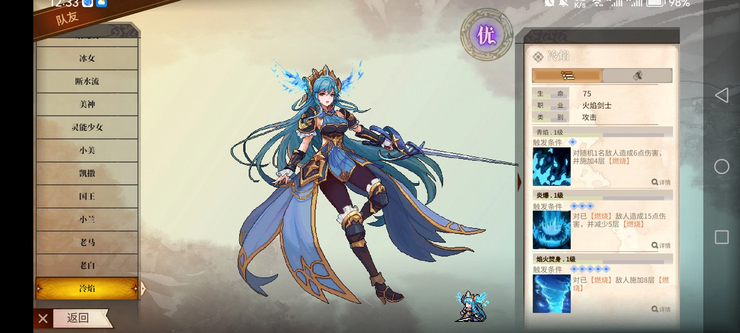 燃烧队主要是靠自己燃烧被动打伤害,被动层数越高伤害越高,对萌新来说燃烧队比较难凑,一般一周目通关角色才能凑齐