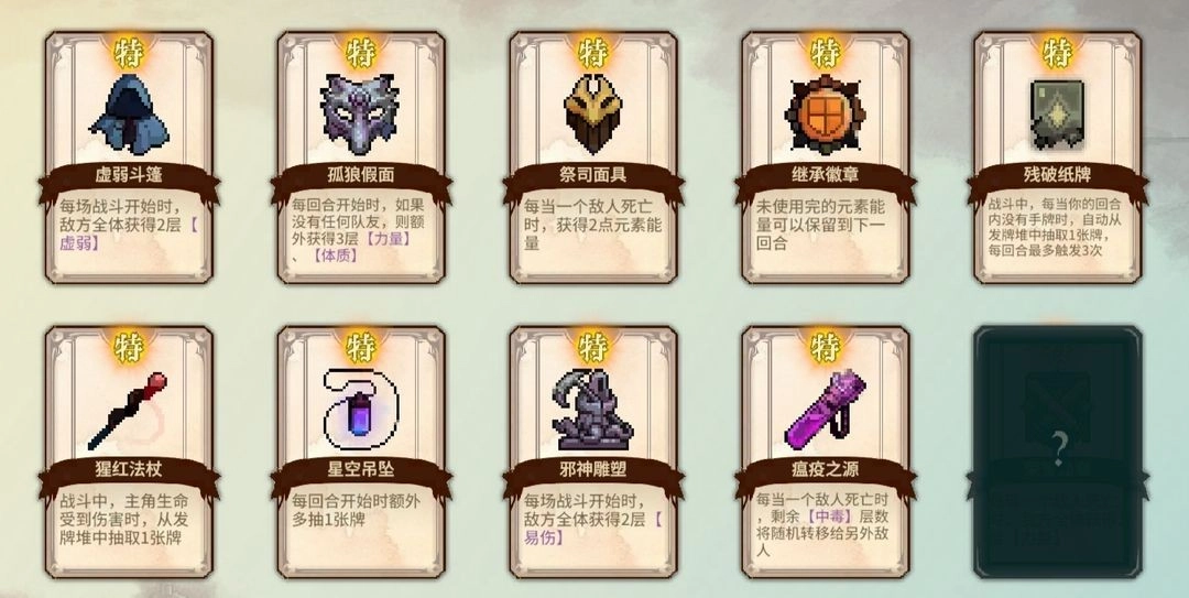 黑科技圣遗物组合:破碎誓约(每次出牌主角掉一滴血),猩红法杖(主角受到伤害摸一张卡牌),剧情模式红玫瑰感情线和自由模式皆可用,挑战模式未知,配合上魔力满溢除了最终BOSS关卡都能当永动机