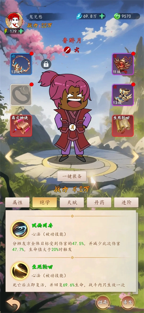 9.弟子除了自带一个主动一个被动,还能再带一个主动和被动,在技能界面技能强化前面有个上下按钮,可以替换主动技能的出手顺序,也就是你可以让你给弟子的武功书先放,让他自带的主动技能后放
