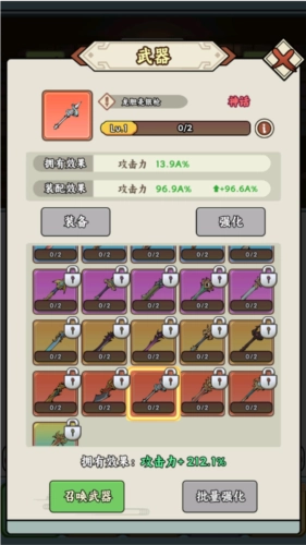 接下来我们跟着新手教程的指引,用钞票去强化攻击力。强化完成后记得领取右上角的任务奖励,这些奖励的灵石之后会成为我们进行各种召唤的主要资源。游戏里有攻击力、体力、体力恢复、暴击率、暴击伤害、攻击速度、连射、三连射、高级攻击力和普通敌人伤害这十项可强化的属性,其中连射、三连射、高级攻击力和普通敌人伤害要等玩家达成对应的强化目标后才会解锁。不同属性的强化能带来不一样的提升,拿到的钞票越多,各项属性就越容易提升,通关也就更轻松啦!(PS:长按加点按钮可以加速升级哦~)