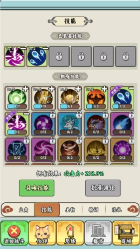 通过完成主线任务25即可解锁商城的技能召唤,装备技能后将会给角色的攻击属性带来质变,角色在闯关过程中也可以释放技能对敌人进行强力打击,不同的技能带来的伤害效果不同,装备技能打开自动施法即可自行释放技能快速过关。