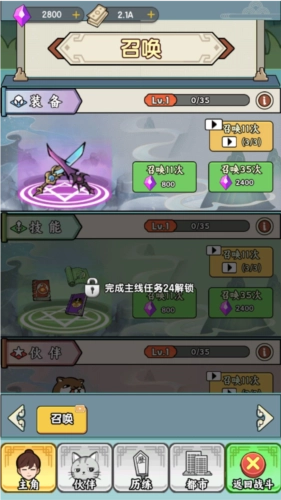 完成主线任务11后将会开启商城,我们可以在商城中召唤装备和角色碎片,通过多次装备召唤可以提升召唤池的等级,更高的召唤池等级可以拥有更高的概率获得高品质装备。集齐同一个角色的30个碎片即可合成解锁对应的角色。