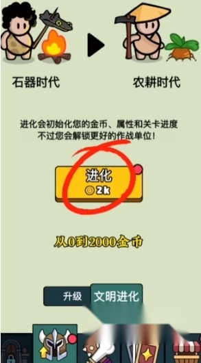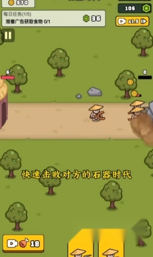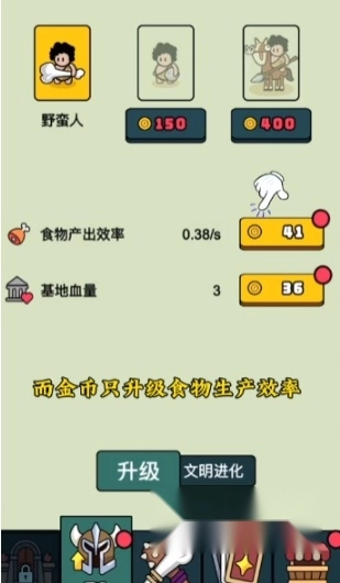游戏开局大家都处于石器时代,不追求通关,专注于刷金币;金币仅用于升级食物以提升效率,不会用来升级血量。