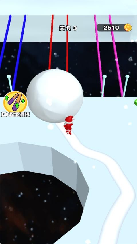 2、通过手指滑动屏幕控制雪球滚动轨迹,接触沿途散落的积雪可持续增大体积规模。