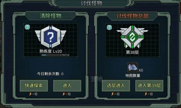 4、清除怪物及怪物总部。清除怪物这张地图怪物分布密集,每天能进入三次,建议使用双倍卡进入,这样获取的经验会更多。怪物总部地图可从清除怪物地图中获得,每天能得到三张,如果暂时打不过可以先留存。升级装置能够增强在怪物总部中的属性抗性等。这张地图相当重要,后期难度会逐步提升,但等新手发展到那个阶段,也已积累了经验,想必能够应对。