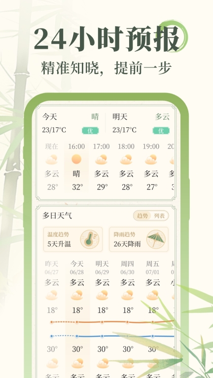 【24 小时天气预报】可随时了解未来一天内天气的动态变化,对温度升降与降雨趋势做到轻松把控。