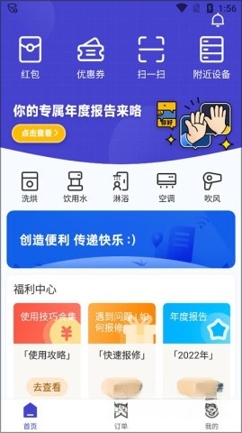1、安装U净,进入首页,您可以选择自助洗衣等多种服务功能。
