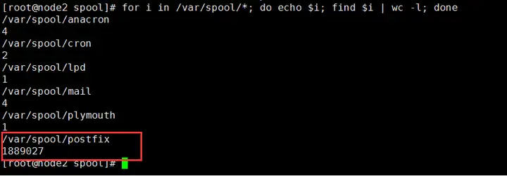 [root@node2 ~]# for i in /var/spool/*; do echo $i; find $i |wc -l; done