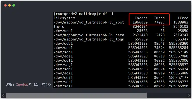 第四步:再次查看Inodes文件数是否被释放?Inodes使用率是否还是100%?