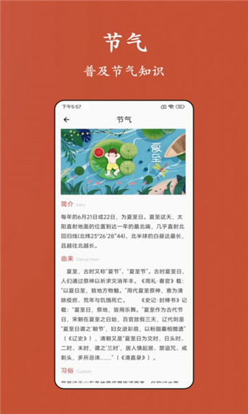 用户可以通过查看节气普及知识来学习到中国的传统文化知识内容
