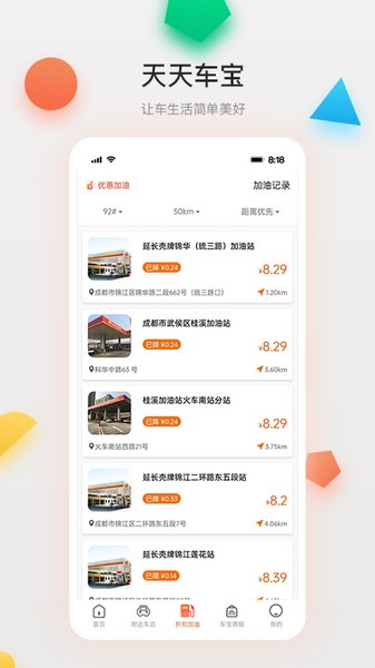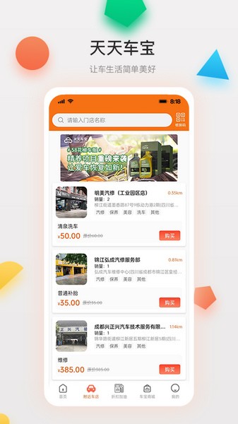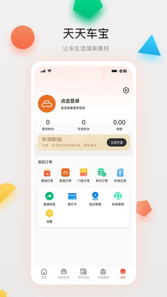 1. 开启天天车宝,界面设有首页、附近车店、折扣加油、车宝商城以及我的板块。其中,首页具备基础功能。