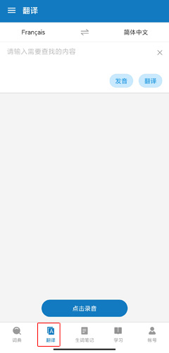 2、翻译页面:用户可以属于要转化的单词或者句子,也可以进行录音进行翻译;