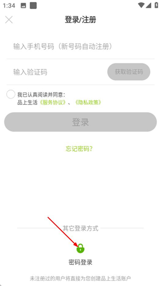 2、在登录注册页面,点击密码登录选项,进入密码登录页面。