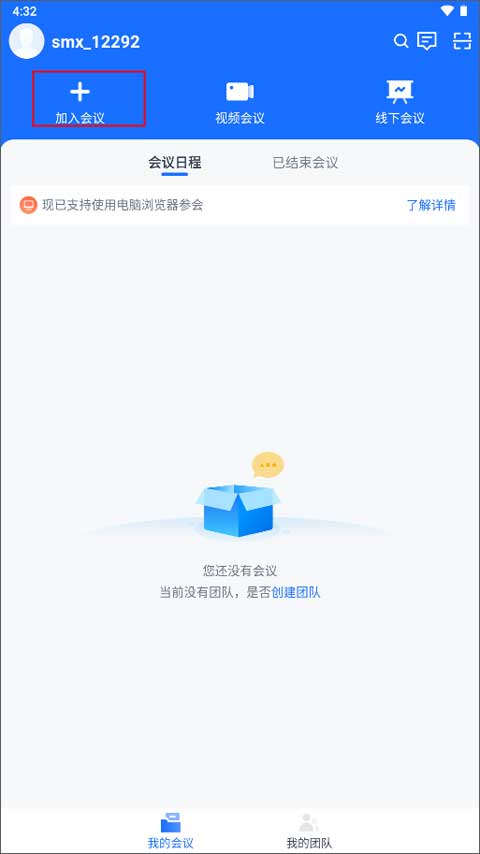 1、打开并默认进入到【我的会议】中,想要加入会议点击上方的加入会议按钮即可。