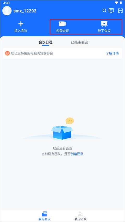 1、上方包含了视频会议和线下会议,因为要开视频会议点击相应按钮即可。