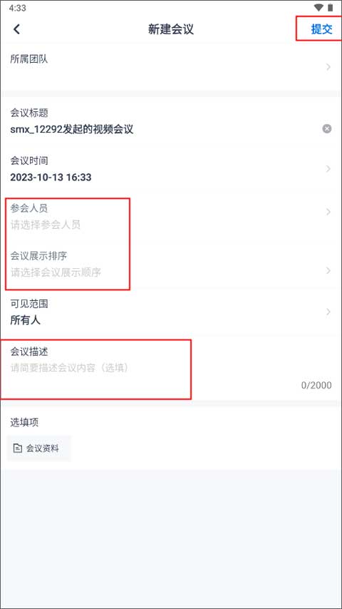 2、于新建会议界面内,对会议时间、参会人员、会议描述等进行编辑,完成编辑后,点击界面右上角的提交按钮,即可成功创建会议。
