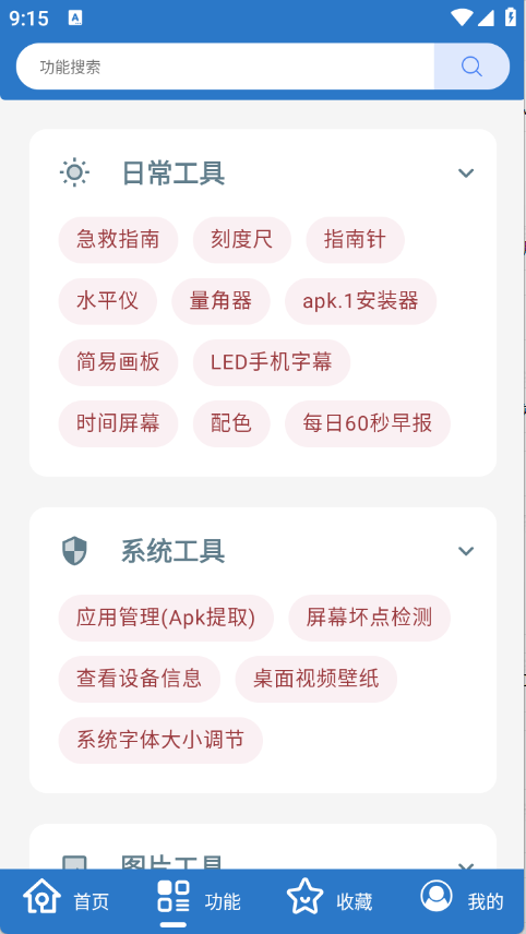 2、“功能”页面集合了大量工具资源,涵盖日常工具、系统工具以及图片工具等。