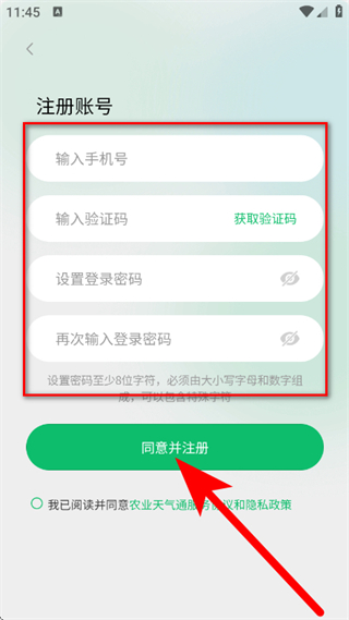 4、输入手机号、验证码,设置登录密码并再次输入密码后,勾选后,点击同意并注册,完成操作。