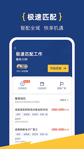 3、建立即时通讯渠道方便双方直接沟通,匹配成功后最快可当日安排入职。平台对薪资发放进行全程监督,切实保障劳动者权益。