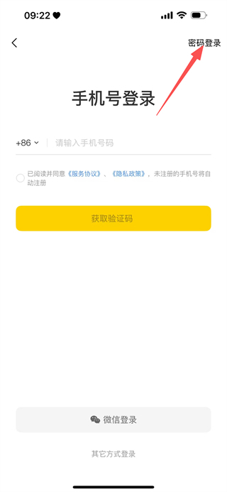 3、在手机号输入页面,点击右上角的密码登录,切换到密码登录页面。