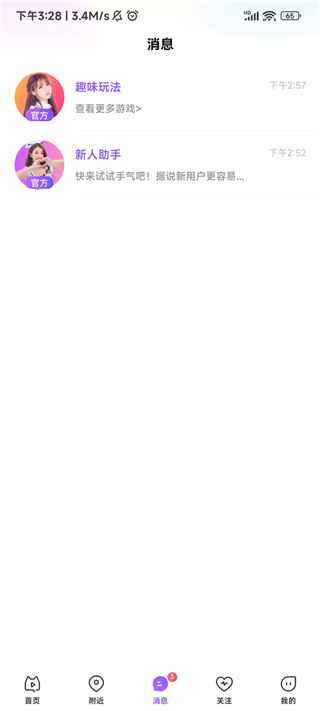 5、点击“消息”选项,这里会有新人助手专门为新用户发送的通知信息,此外,后续与主播的聊天记录也能在这个板块中找到。